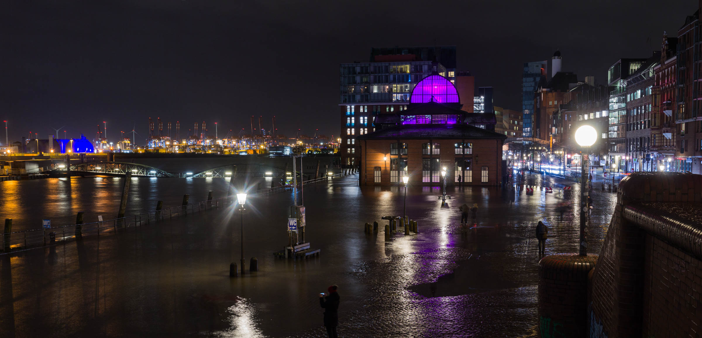 Mitte Februar 2020 drückte der Wind wieder einmal das Wasser der Nordsee in die Elbe und sorgte für einen überschwemmten Fischmarkt. Solange es bei einer solch leichten Überflutung bleibt, stellt dieses Schauspiel immer wieder ein interessantes Fotomotiv dar, insbesondere in der Dunkelheit.