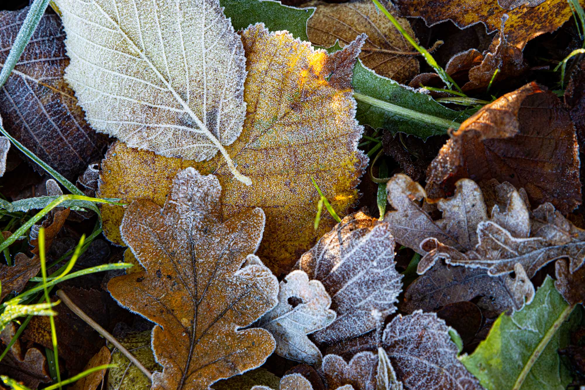 Während die Morgensonne dem Herbstlaub im Niendorfer Gehege von Minute zu Minute sattere Farben entlockt, hebt der erste Morgenfrost die feinen Strukturen der einzelnen Blätter hervor.