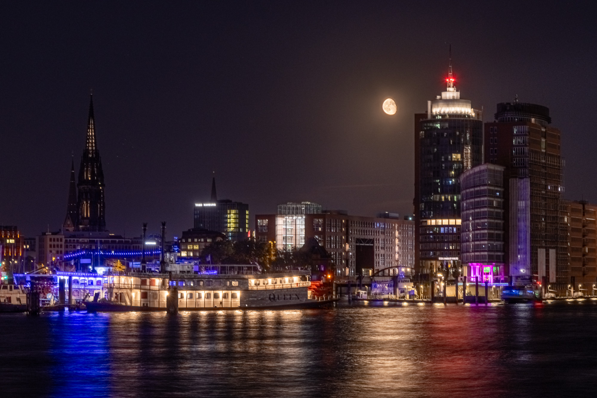 Dass ich eine Schwäche für Mondfotos habe, hat man vielleicht schon anhand der früheren Galerien erahnt. Diesen September allerdings braucht es vier Anläufe, bis sich der dann schon nicht mehr ganz so volle Mond eindrucksvoll und außergewöhnlich weit im Norden über der Hamburger Skyline zeigte.