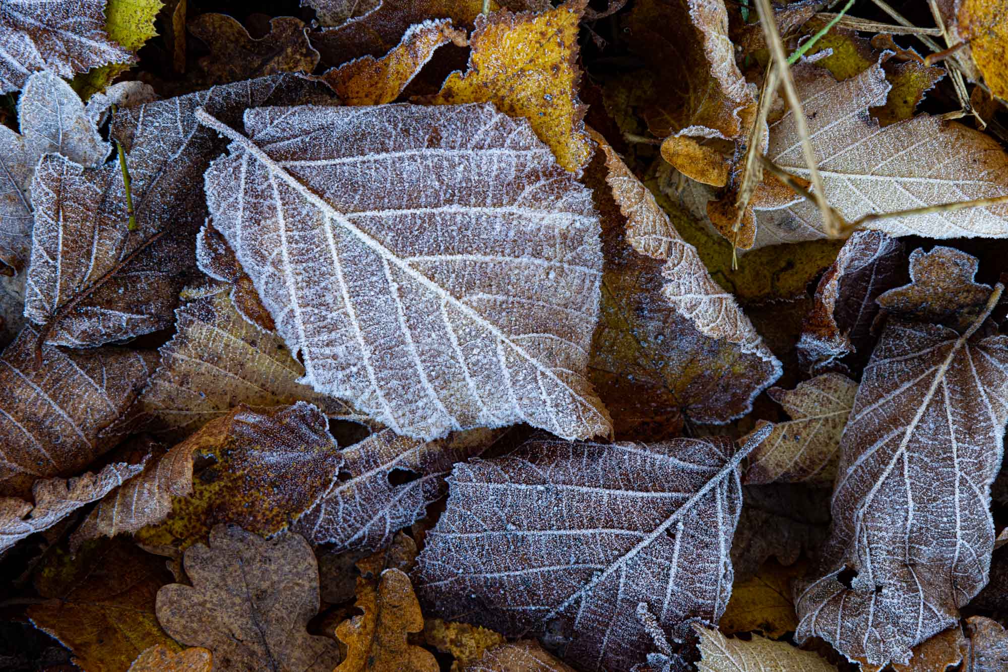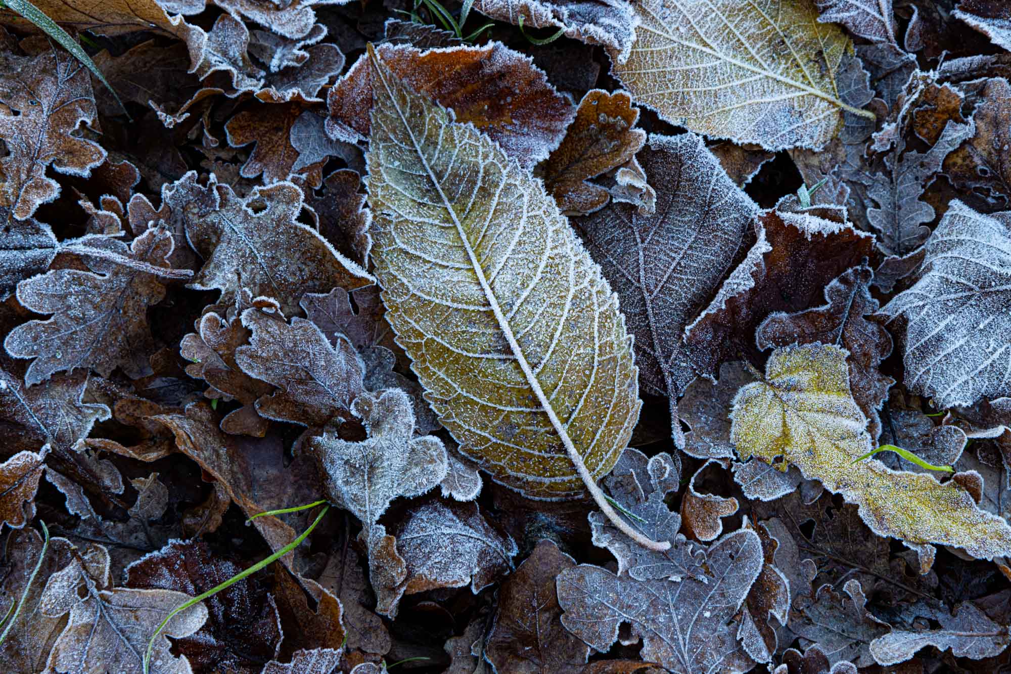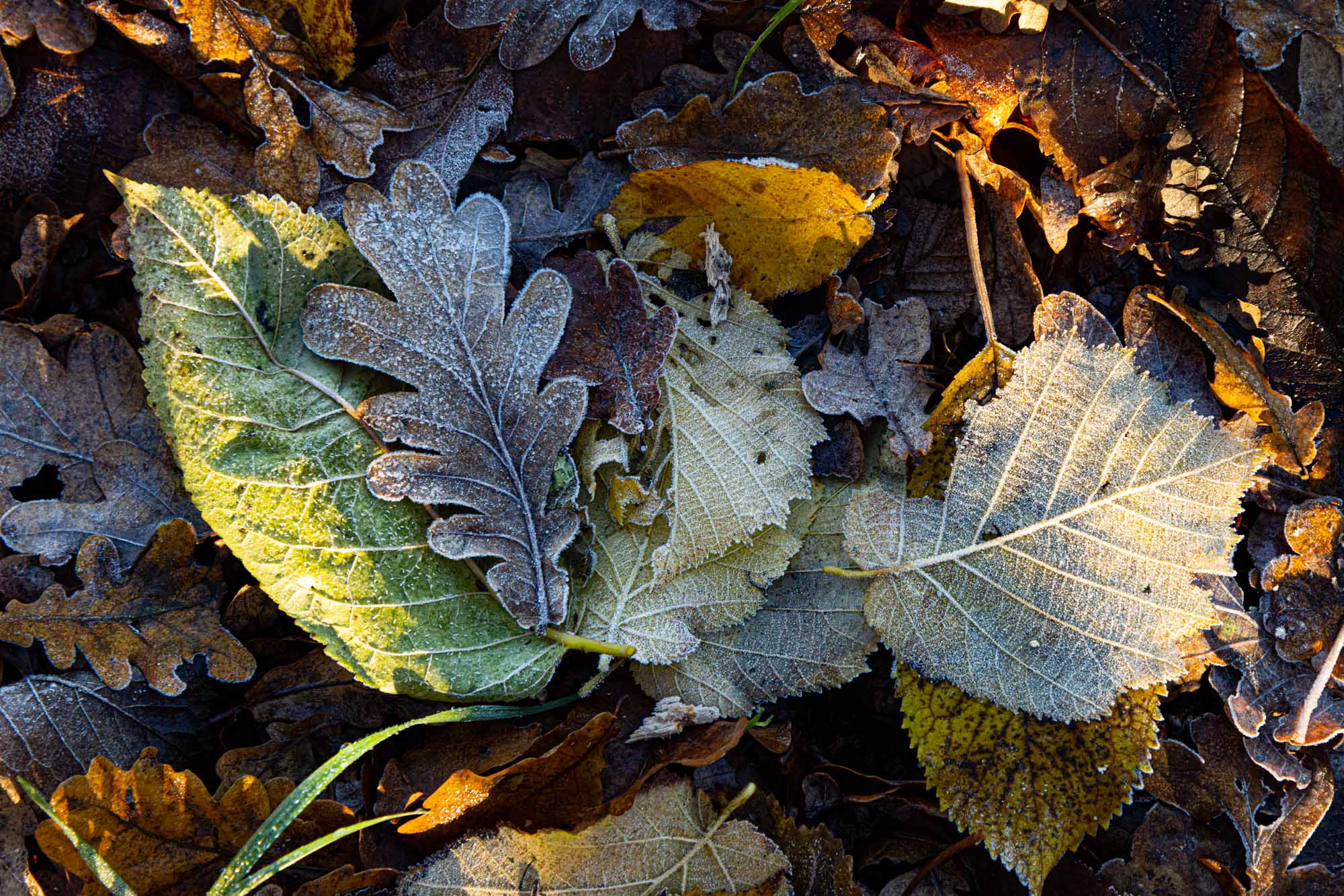 War es beim letzten morgendlichen Spaziergang durchs Niendorfer Gehege noch der Tau, der an den Spinnennetzen hing, so hatte sich diesmal der erste Frost über herabgefallene Blätter gelegt. Schön zu sehen ist, wie während der kleinen Aufnahme-Session die Sonne immer mehr an Kraft gewinnt und dem Laub zunehmend wärmere Farben entlockt.