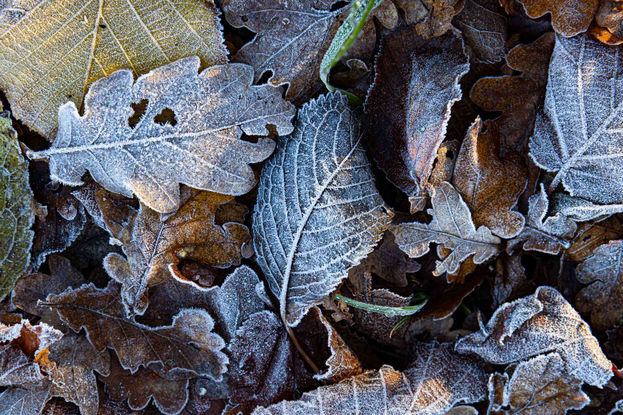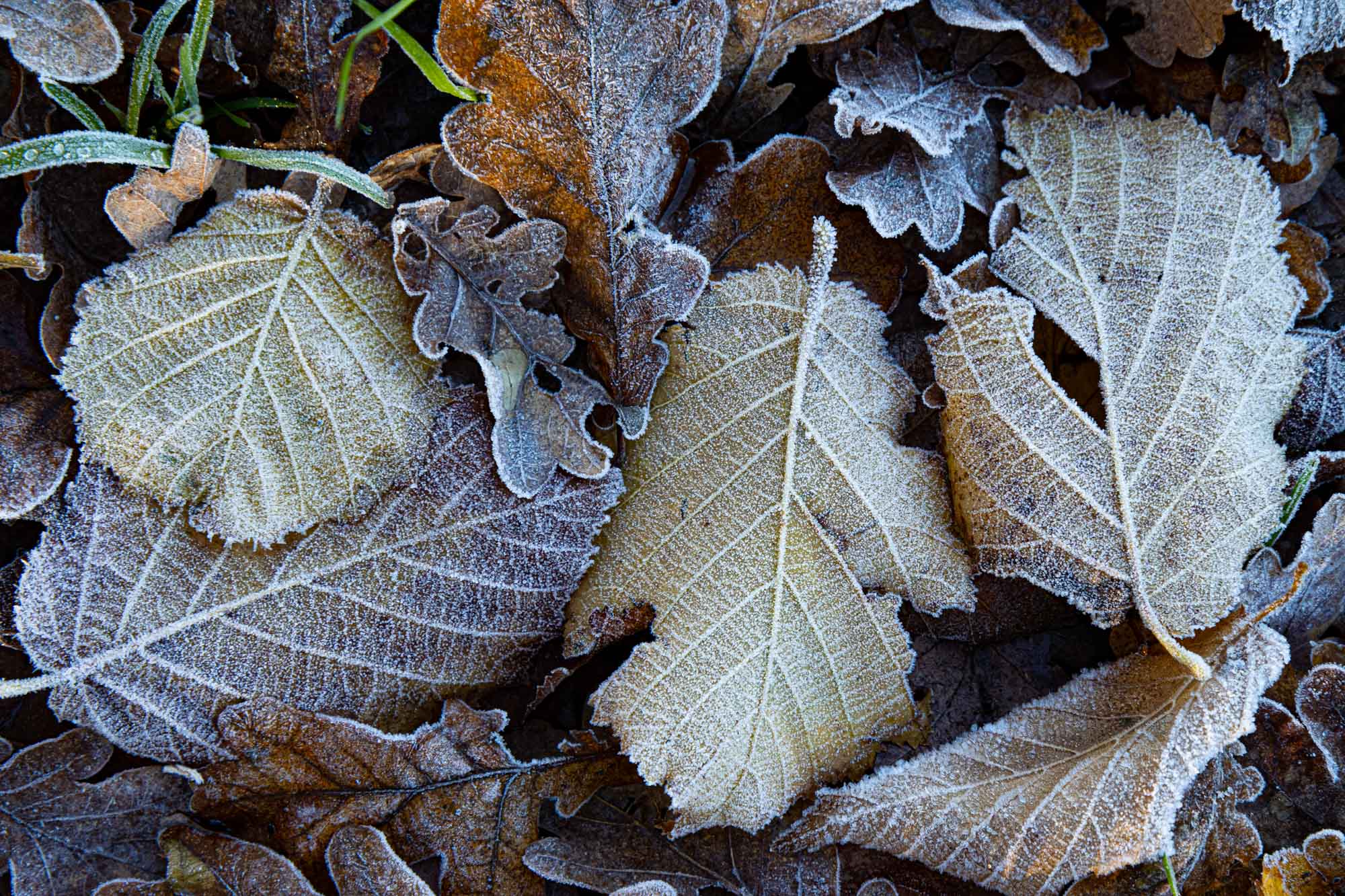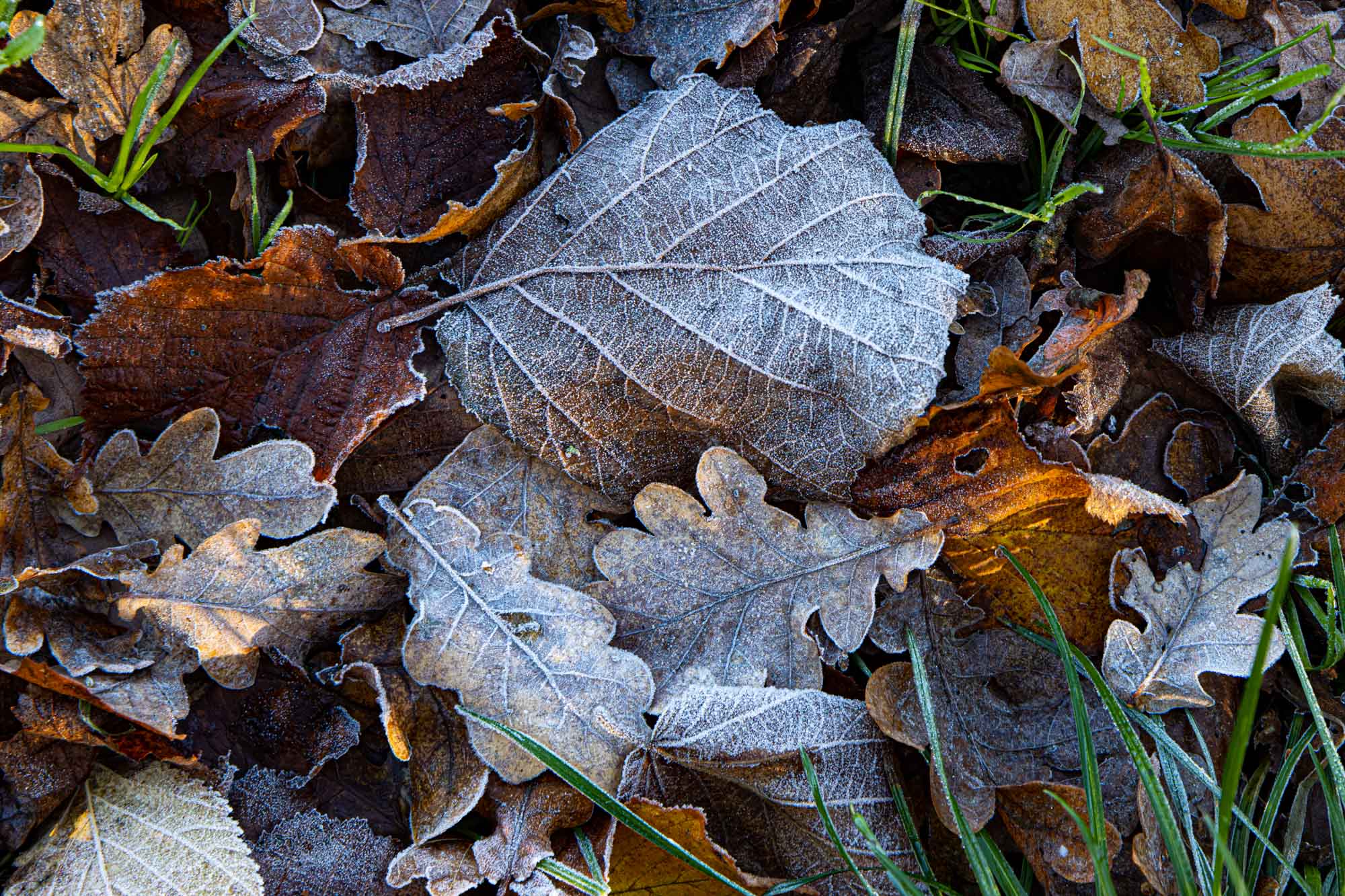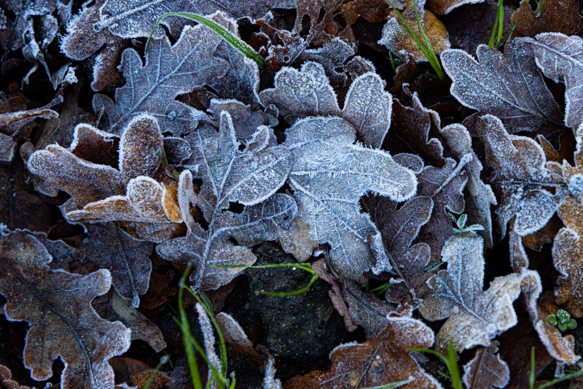 War es beim letzten morgendlichen Spaziergang durchs Niendorfer Gehege noch der Tau, der an den Spinnennetzen hing, so hatte sich diesmal der erste Frost über herabgefallene Blätter gelegt. Schön zu sehen ist, wie während der kleinen Aufnahme-Session die Sonne immer mehr an Kraft gewinnt und dem Laub zunehmend wärmere Farben entlockt.